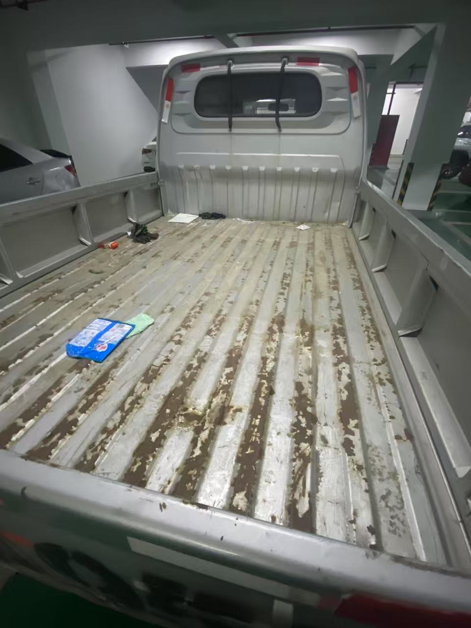 2.现场查勘:车辆外观成色较好,车身局部位置有刮擦痕迹及二次喷漆,车厢后栏板有碰撞变形,车辆启动正常,中控显示屏,喇叭、电动门窗使用正常,内饰完整,发动机轻微渗油,备胎缺失。因条件限制,车辆无法举升,底盘情况不详。
